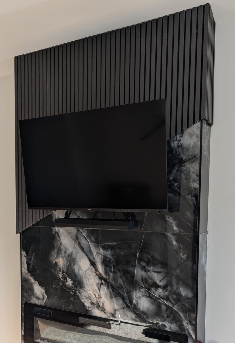 65-inch TV professionally mounted on a wall with custom vertical wood slat panels, concealed wiring, and a seamlessly integrated soundbar.